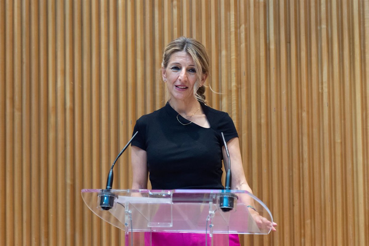 La vicepresidenta segunda y ministra de Trabajo y Economía Social, Yolanda Díaz, interviene durante el acto conmemorativo por los 15 años de la Red Equi Sastipen Rroma, en el Congreso de los Diputados, a 19 de mayo de 2025, en Madrid (España). - Gustavo Valiente - Europa Press
