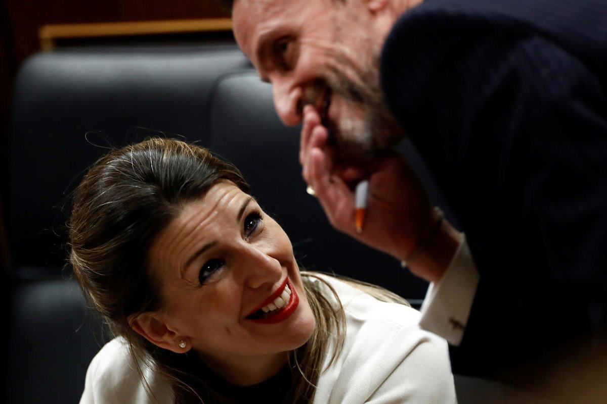 La ministra de Trabajo, Yolanda Diaz, habla con el portavoz adjunto de Ciudadanos en el Congreso, Edmundo Bal, durante el pleno celebrado este jueves en el Congreso de los Diputados para aprobar una nueva prórroga del estado de alarma, en un debate en e - Pool - Archivo