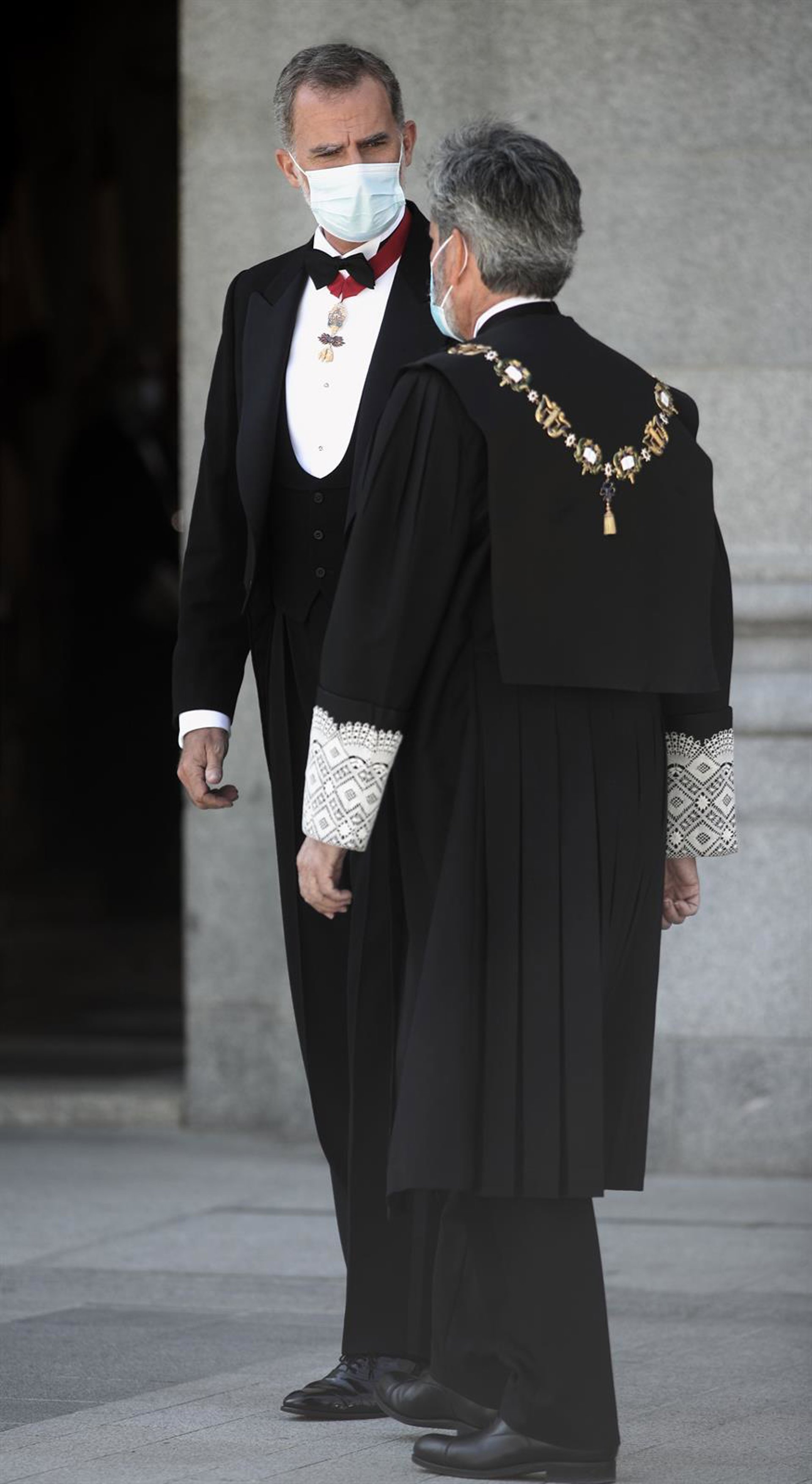 El presidente del Tribunal Supremo y del Consejo General del Poder Judicial (CGPJ), Carlos Lesmes (d), y el Rey Felipe VI, llegan al Palacio de Justicia, en Madrid (España), a 7 de septiembre de 2020. El Rey preside el acto de apertura del año judicial - Eduardo Parra - Europa Press