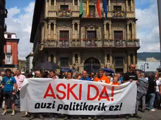 Los asistentes a la concentración, que se ha desarrollado en la plaza del Ayuntamiento de Pamplona, se han reunido tras la pancarta 'Aski da. Auzi politikorik ez' (¡Basta ya! No a los juicios políticos). En la cabeza de la pancarta se ha situado Xanti Kiroga, uno de los absueltos en este caso.