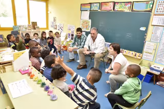 El alcalde de Pamplona, Joseba Asiron, acompañado por el concejal de barrio de San Jorge, Aritz Romeo, han visitado este jueves el colegio público San Jorge. Se trata del centro que cuenta con el mayor nivel de diversidad cultural de la ciudad, dado que más del 90 por ciento del alumnado que asiste a sus aulas es de origen inmigrante.
