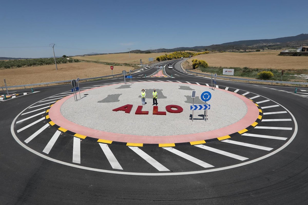 Las dos rotondas de la variante de Allo, que conecta la localidad con Sesma y Arróniz, ya se encuentran abiertas al tráfico. El consejero de Cohesión Territorial del Gobierno foral, Bernardo Ciriza, y la alcaldesa de Allo, Susana Castanera, han comprobado el resultado de las obras que permiten mejorar la seguridad de esta vía por la que circulan a diario 4.400 vehículos.