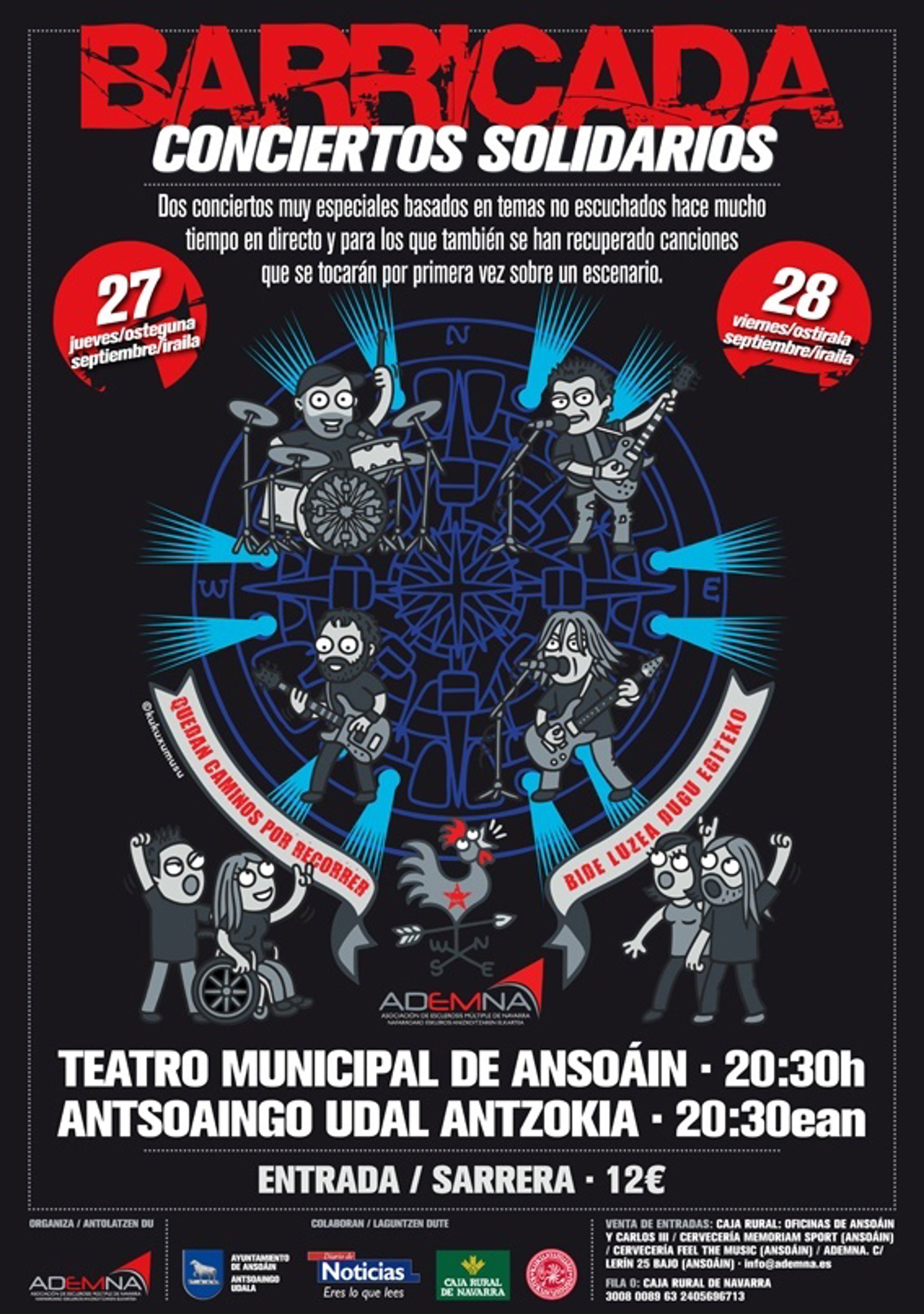 La Asociación de Esclerosis Múltiple de Navarra Ademna celebrará los próximos 27 y 28 de septiembre, a las 20.30 horas, en el Teatro Municipal de Ansoáin dos conciertos solidarios de Barricada cuyos beneficios íntegros serán destinados a la asociación.