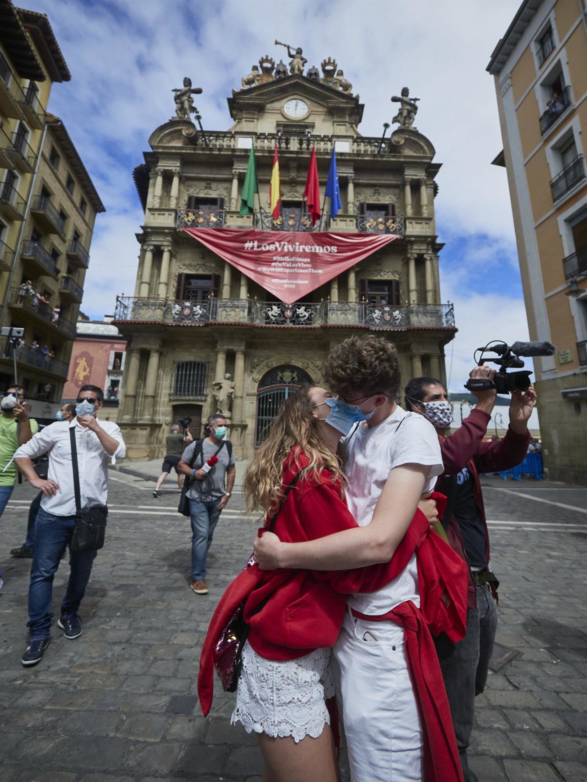Una pareja con mascarillas se besa en la plaza Consistorial de Pamplona este 6 de julio de 2020 en el día en que deberían haber comenzado los Sanfermines, suspendido por la pandemia de Covid-19. - EDUARDO SANZ-EUROPA PRESS