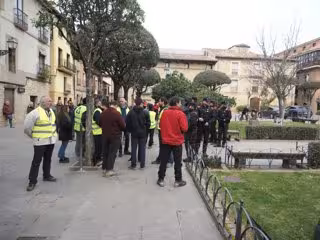 Un grupo de agricultores del movimiento 6F se ha desplazado este lunes a las inmediaciones del Castillo de Olite, con motivo de la asistencia de la presidenta de Navarra, María Chivite, el lehendakari del Gobierno vasco, Iñigo Urkullu, y el presidente de Nueva Aquitania, Alain Rousset, a la asamblea anual de la Eurorregión, cuya presidencia asume la Comunidad foral.