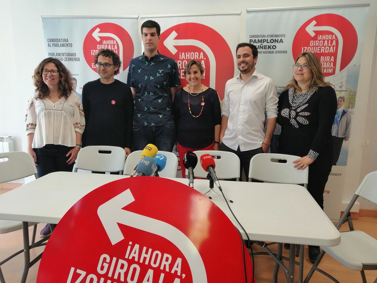 El coordinador federal de IU, Alberto Garzón, ha destacado que el próximo 26 de mayo "tenemos la oportunidad de reproducir el cambio en Navarra" y se ha mostrado "absolutamente cómodo y satisfecho" con el acuerdo alcanzado entre Geroa Bai, EH Bildu, Podemos e Izquierda-Ezkerra en la comunidad.