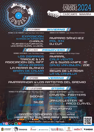 Organizado con la colaboración de Gobierno de Navarra, el Ayuntamiento de Cascante y en el marco del programa Innova, Estaciones Sonoras ha programado cuatro ciclos de conciertos, uno por cada estación del año, que combinarán música rock, indie, actuaciones dj's, experiencias gastronómicas e iniciativas solidarias.