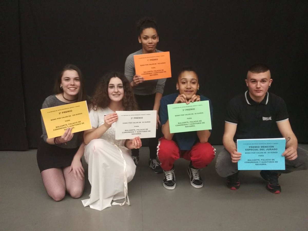 Anneya Gelis Ruiz de Larramendi, del Alaitz BHI (primer premio), y Ana Villayandre Álvarez (segundo premio), Uxuri Etxegia Etxebeste (tercer premio) y Sandra Fuente Salazar de la Cruz (tercer premio), las tres del IES Plaza de la Cruz, han sido las ganadoras de la II Olimpiada de Artes Escénicas, Música y Danza, organizada por la Asociación Artística Izpiritu Sortzailea, mientras que Adrián Martínez Arpón de Alaitz BHI, ha obtenido una mención especial del Jurado. Han participado diez alumnos seleccionados por sus centros, los únicos que ofertan en Pamplona este tipo de Bachiller.