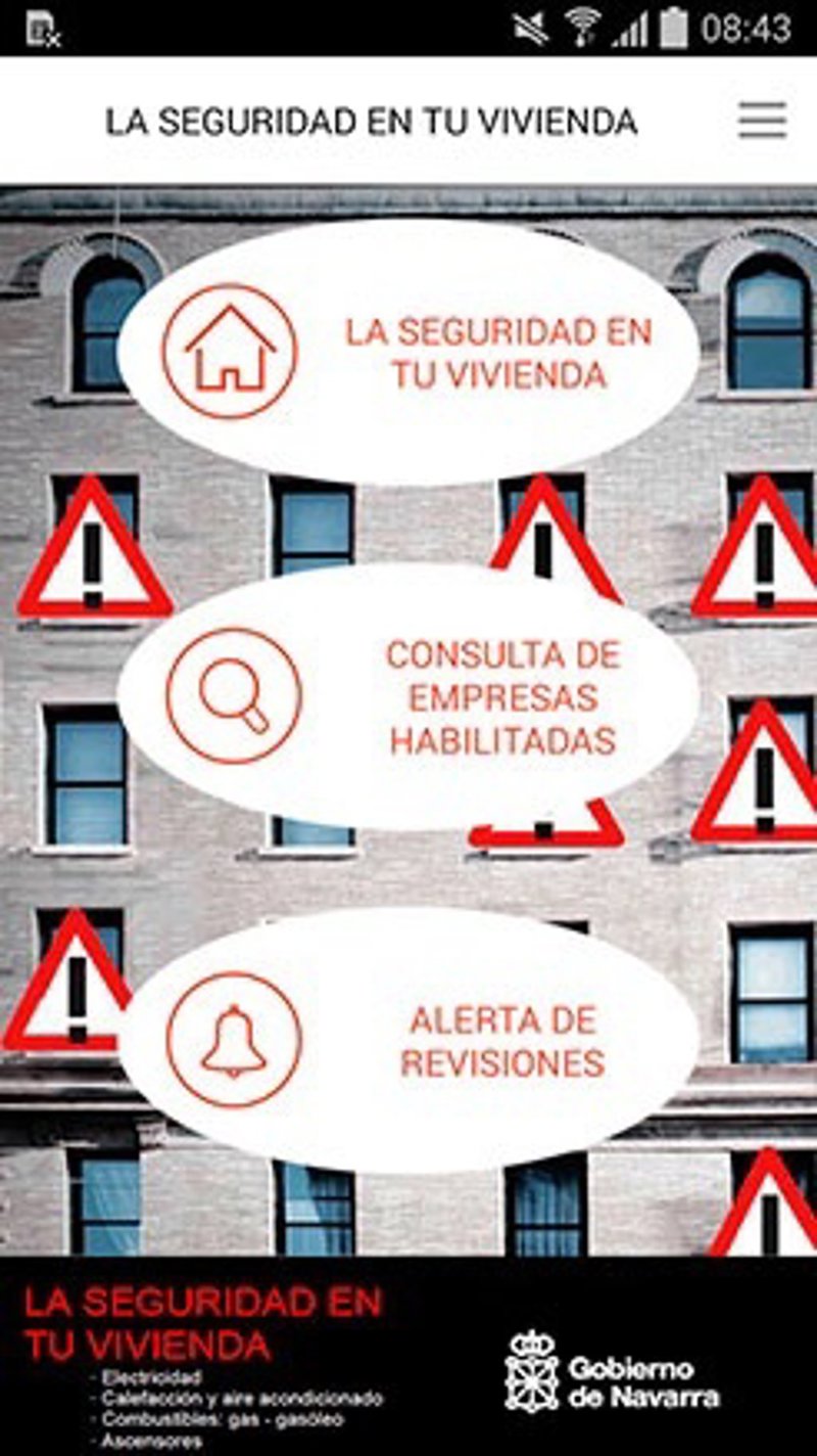 El Gobierno de Navarra ha desarrollado una aplicación para dispositivos móviles en la que se ofrece información sobre las obligaciones de la población en lo referente a revisiones periódicas, mantenimiento e inspecciones de las instalaciones de electricidad, calefacción y aire acondicionado, combustibles (gas y gasóleo) y ascensores en viviendas y comunidades de vecinos y contribuir así a la prevención de accidentes domésticos.