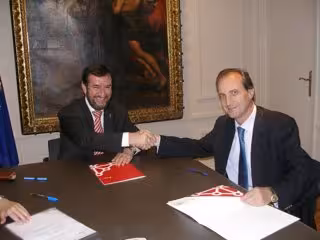 El consejero en funciones de Cultura y Turismo del Gobierno de Navarra, Juan Ramón Corpas, y el fiscal superior de la Comunidad Foral de Navarra, Javier Muñoz, han suscrito un convenio de colaboración entre ambas instituciones para depositar de manera indefinida en el Archivo General de Navarra la documentación producida por la actividad de la Fiscalía de la Comunidad Foral.