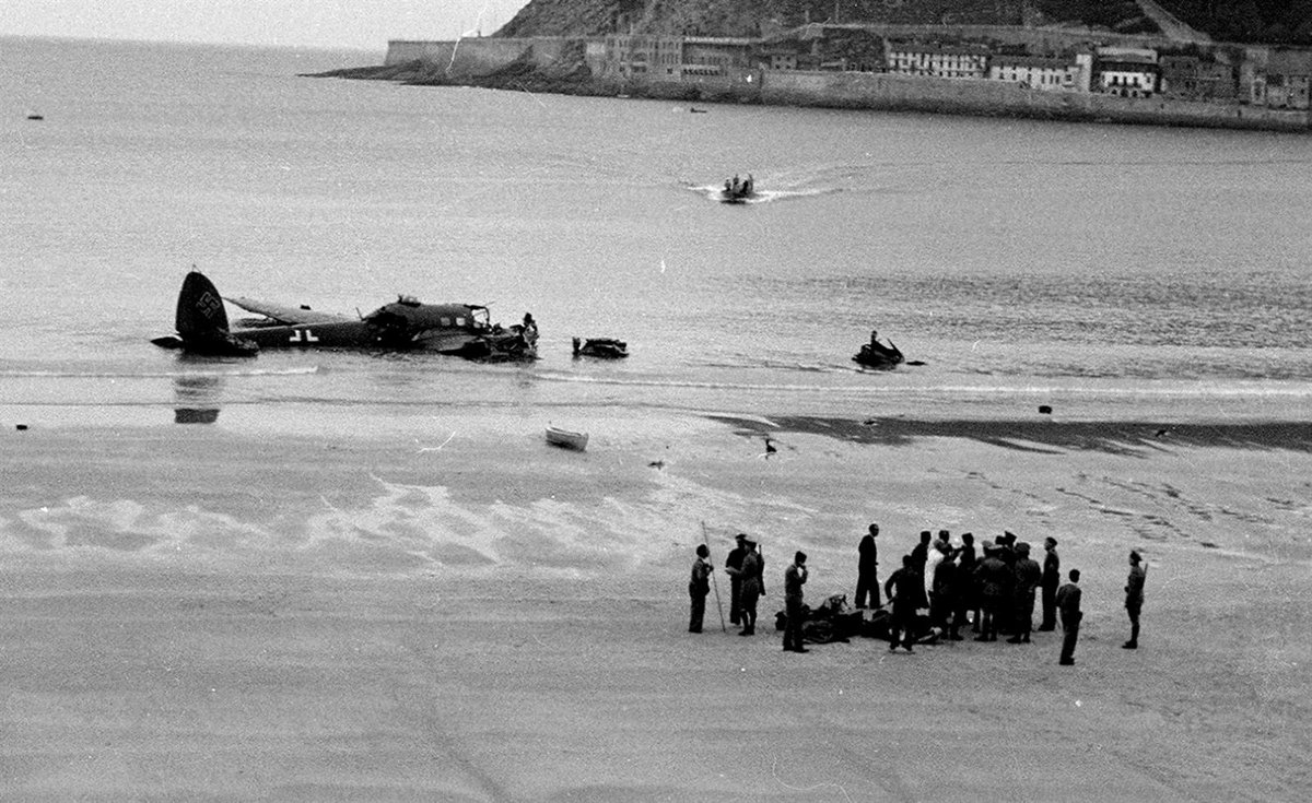 La microexposición se cierra con unas fotografías tomadas precisamente el 8 de mayo de 1945, día de la finalización de la guerra en Europa, en la playa de la Concha de San Sebastián de un avión bombardero Heinkel 111. Dicha aeronave, pilotada por el oficial belga de las SS León Degrelle, hizo un aterrizaje de emergencia en la playa de la capital guipuzcoana tras volar desde Oslo huyendo de la capitulación de las fuerzas alemanas en Noruega, ha informado el Gobierno foral.