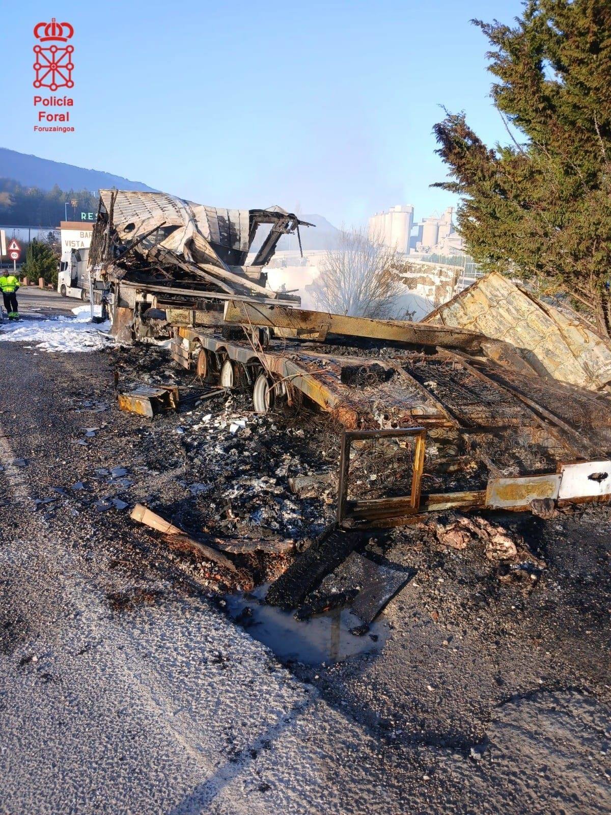 Un camión articulado estacionado en Olazagutía que transportaba dos 'mobil-home' ha quedado totalmente calcinado tras un incendio declarado esta pasada madrugada.