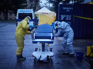Dos voluntarios de DYA Navarra, una asociación sin ánimo de lucro que nació para prestar ayuda y auxilio a todas aquellas personas que se encontrasen en situación de riesgo, desinfectan una de las camillas - Eduardo Sanz - Europa Press