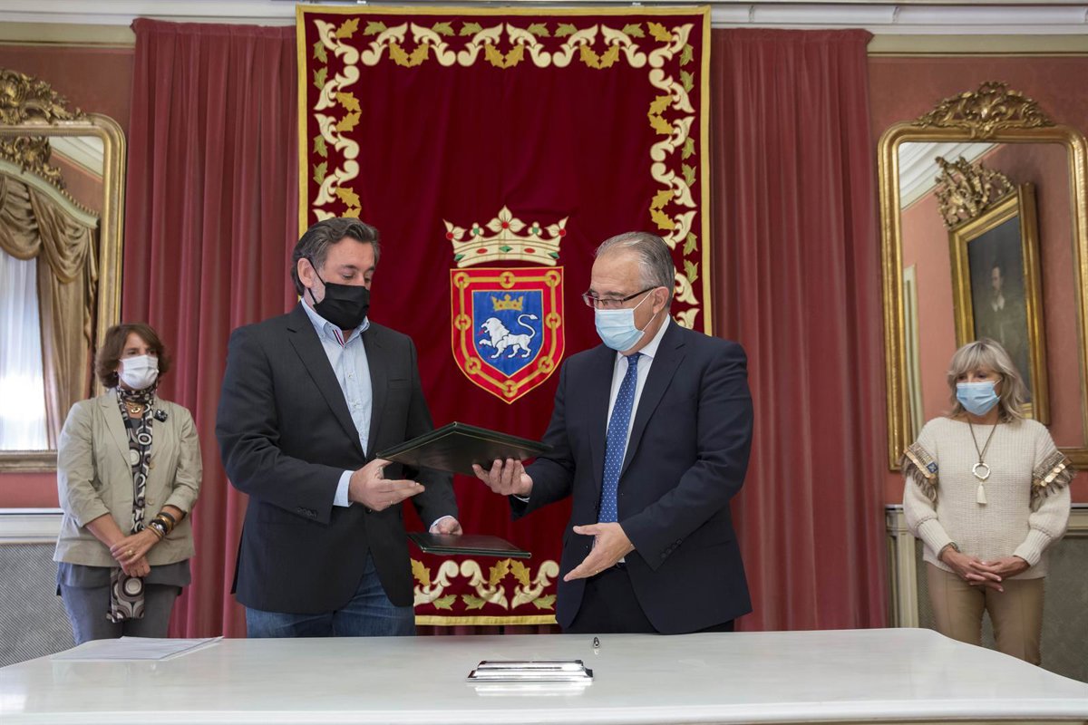 El alcalde de Pamplona, Enrique Maya, y el presidente de ANVITE, José Ignacio Toca, han suscrito, en un acto que ha tenido lugar en el Salón de Recepciones de la Casa Consistorial, un convenio a través del cual el Ayuntamiento se compromete a autorizar a la Asociación Navarra de Víctimas de ETA la instalación de placas en los lugares donde se cometieron cada uno de los atentados perpetrados por la banda terrorista en Pamplona, otorgando la correspondiente licencia de utilización del dominio público.