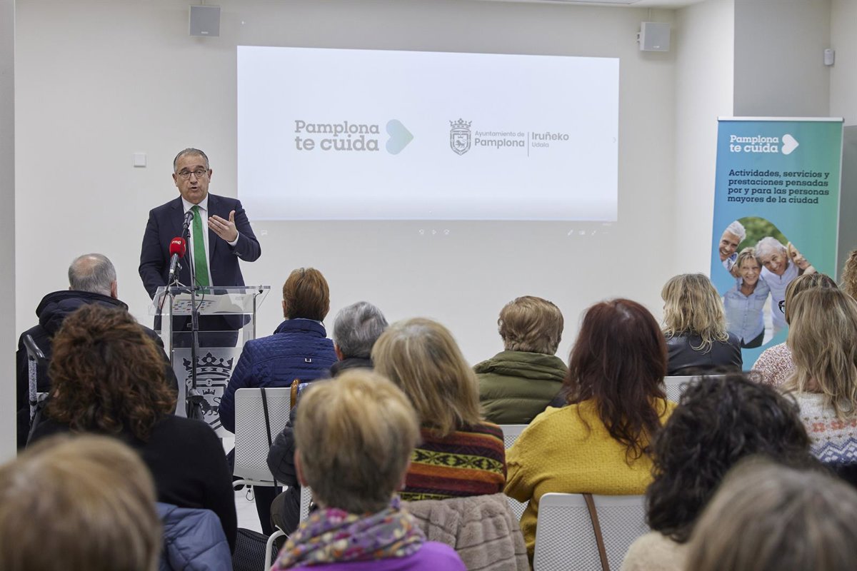 El alcalde de Pamplona, Enrique Maya, y la concejala delegada de Servicios Sociales, Acción Comunitaria y Deporte, María Caballero, han acudido este viernes al centro intergeneracional de Santa María La Real para mostrar el apoyo municipal al lanzamiento de una iniciativa de cuidado de personas de avanzada edad basada en la colaboración y enmarcada en las Redes de Mayores.
