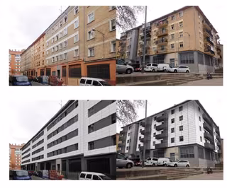 El convenio marco será desarrollado mediante convenios concretos con las comunidades de vecinos de los portales de Doctor Salva 1, 3, 5 y 7, Doctor Labayen 17 y 19, y Sanducelai, 5. Los siete edificios, de idéntica tipología y con altura uniforme de planta baja y cuatro pisos, se construyeron en 1970. Se ubican en la manzana limítrofe con el río ubicada al Sur del conjunto de San Jorge que se encuentra ocupada en parte por las denominadas casas de Gridilla, un edificio de propiedad municipal declarado fuera de ordenación por el planeamiento. En total son 60 viviendas, de superficies útiles que en su mayoría no superan los 75 m2 y que cuentan con salón, cocina, baño y tres dormitorios. Tienen doble orientación, a calle y al amplio espacio interior de la manzana.
