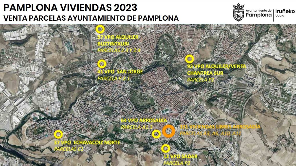 El Consistorio, según ha informado en una nota, sacará a subasta una veintena de parcelas en Arrosadía - Sadar, Buztintxuri, Etxabakoitz Norte y Txantrea Sur, por un importe de 23,88 millones de euros.