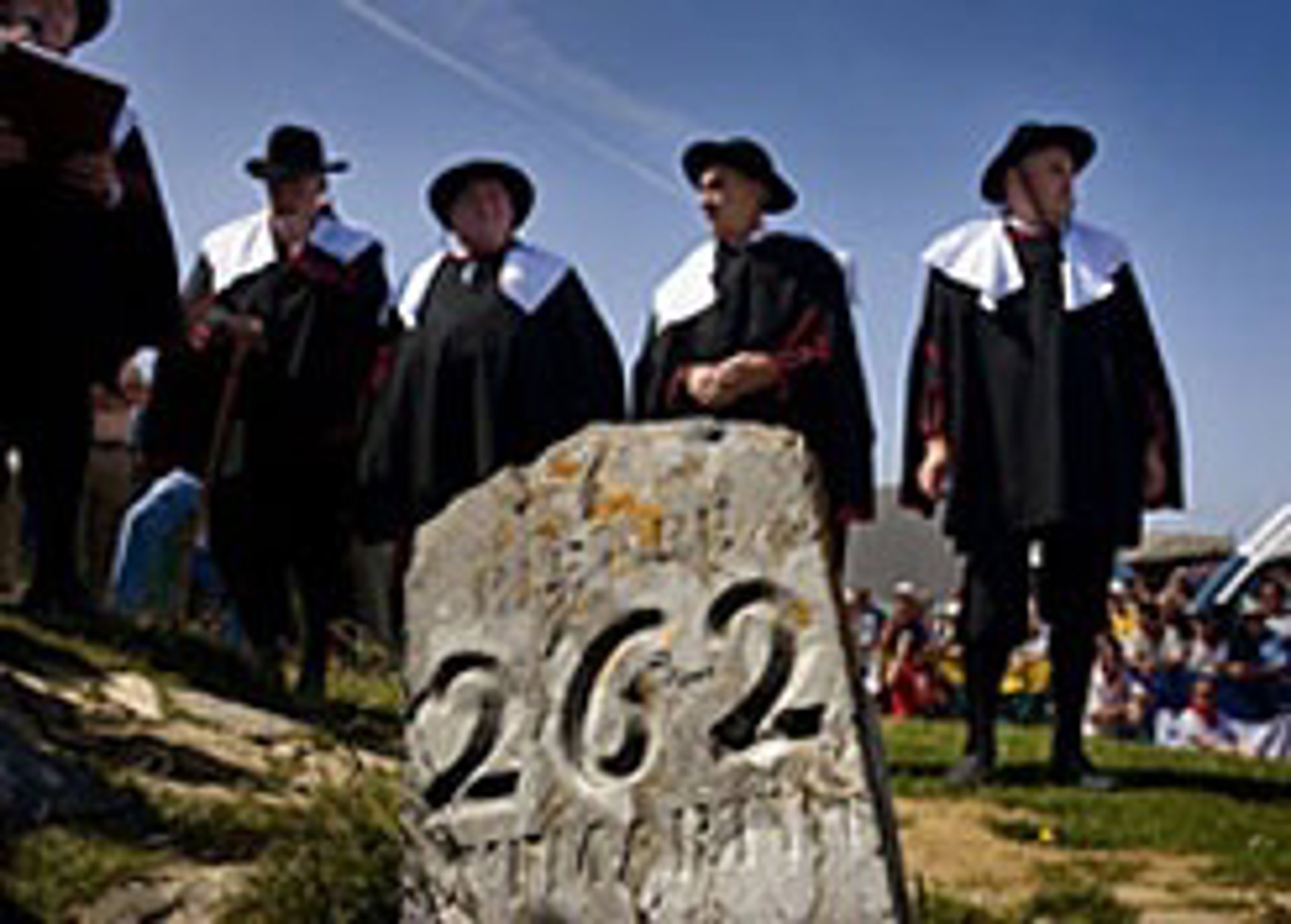Justo antes de la entrega de los animales, los alcaldes de los valles de Roncal y Baretous, ataviados con la indumentaria tradicional de la zona, renuevan el compromiso de paz que puso fin a las disputas.