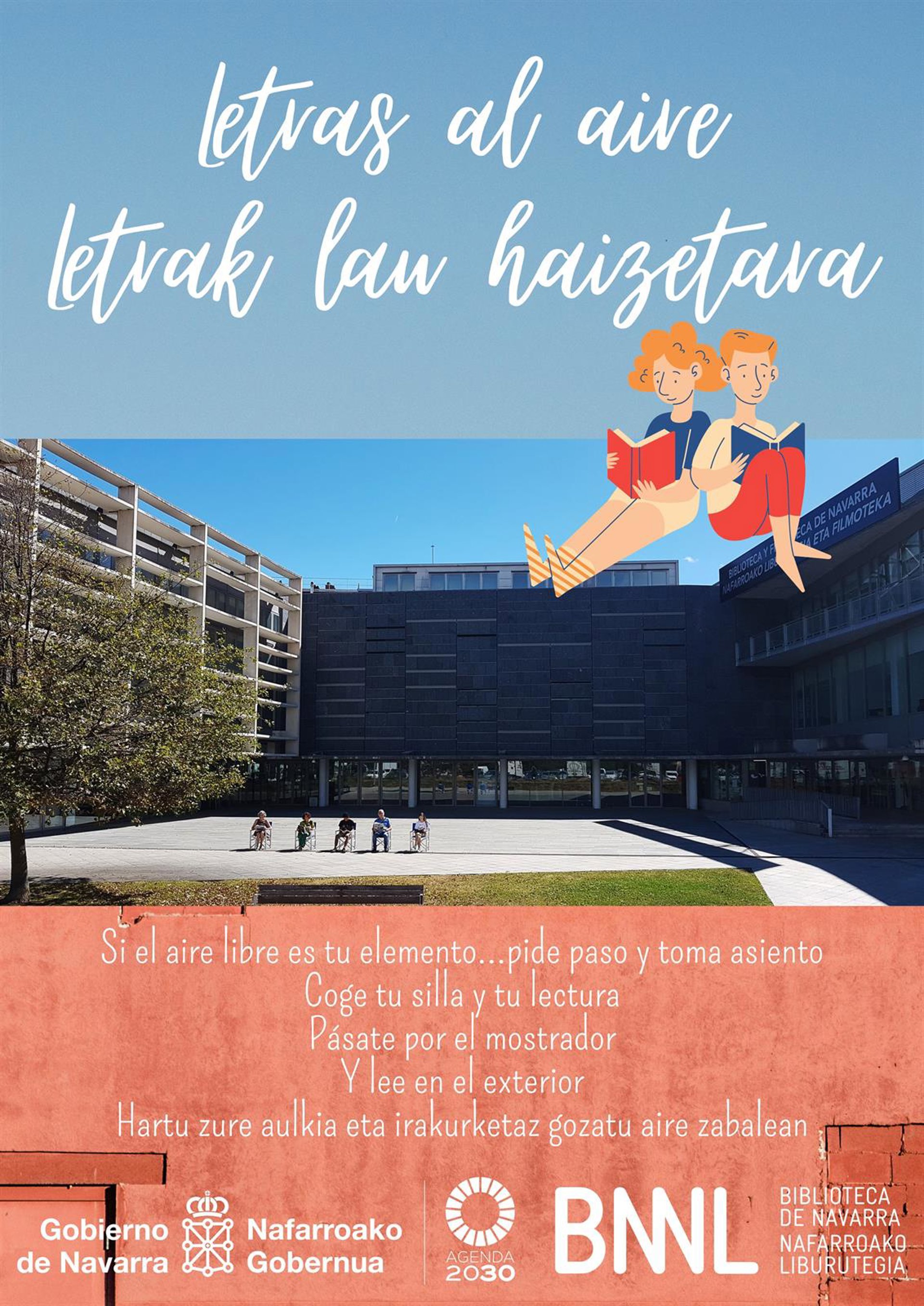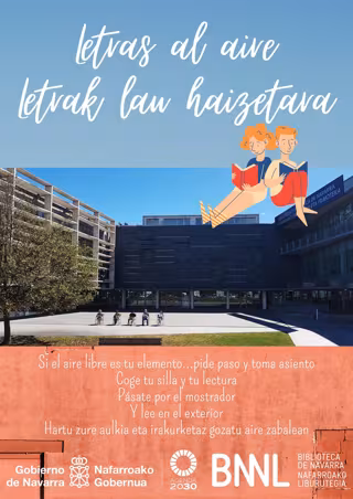 La Biblioteca de Navarra saca la lectura a la calle con su iniciativa 'Letras al aire-Letrak lau haizetara', que comenzará este próximo lunes día 16 de agosto, durará mientras el tiempo acompañe y se desarrollará en la plaza exterior del centro. Está destinada a los usuarios de sus instalaciones.