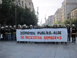 Varias decenas de bomberos, de los sindicatos LAB y CCOO, se han concentrado a las 10.30 horas en la avenida Carlos III frente al Palacio de Navarra tras una pancarta en la que se decia 'Zerbitzu publikoen alde. Se necesitan bomberxs'.