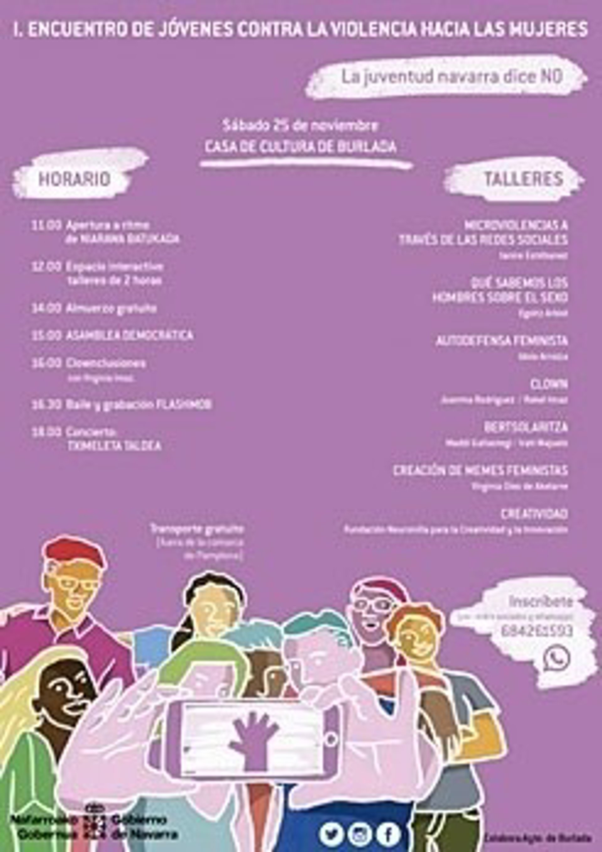 El próximo sábado, 25 de noviembre, tendrá lugar en la Casa de Cultura de Burlada el I Encuentro de jóvenes contra la violencia hacia las mujeres. Organizado por el Instituto Navarro para la Igualdad en colaboración con la subdirección de Juventud y el Consejo de la Juventud de Navarra, durante la jornada se llevarán a cabo diversas actividades como talleres temáticos y actividades musicales.