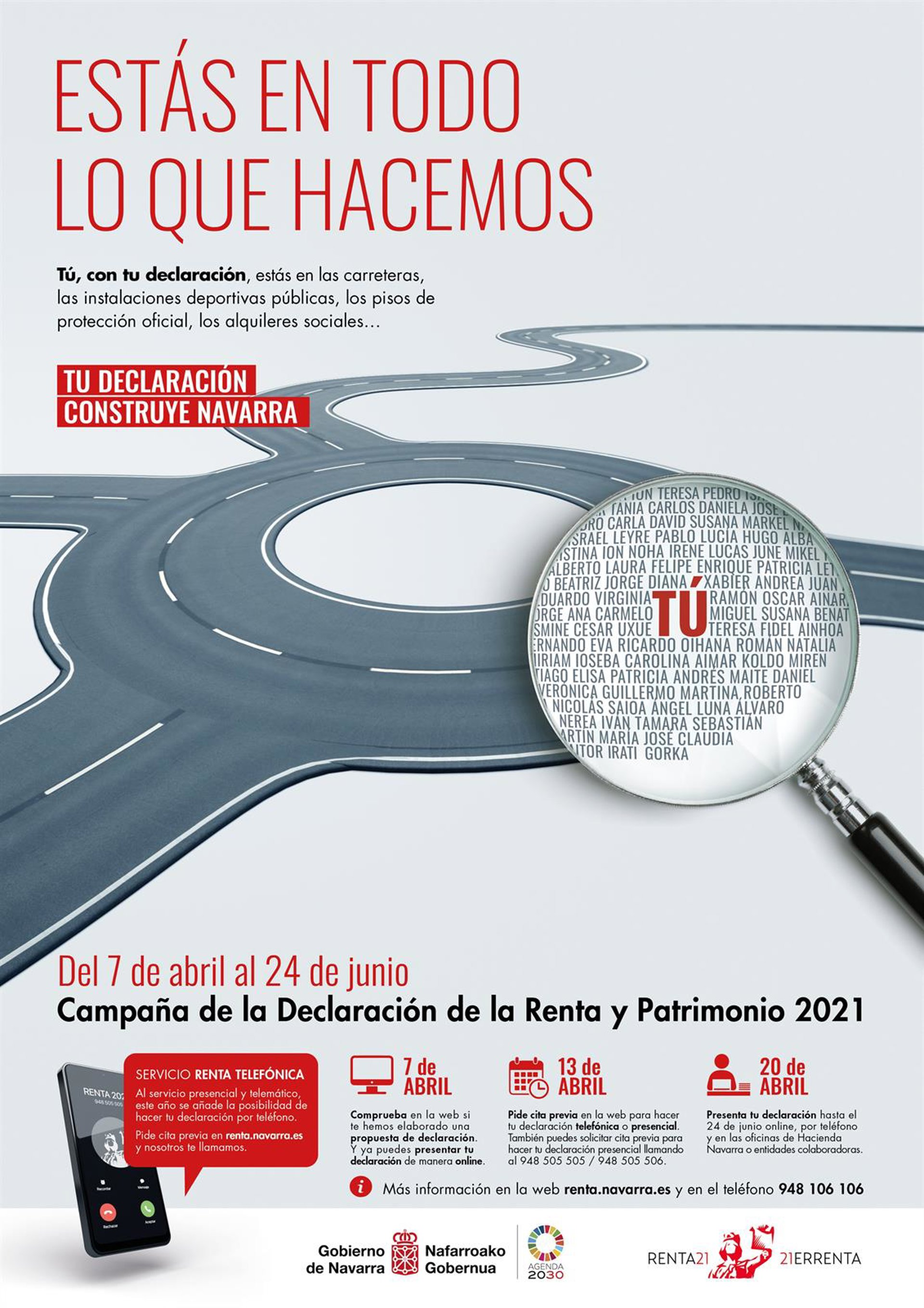 La campaña de la Renta y Patrimonio 2021 se extenderá en Navarra entre el 7 de abril y el 24 de junio. A partir del jueves, por tanto, las personas contribuyentes podrán consultar en la página web renta.navarra.es las propuestas elaboradas por la Hacienda Foral de Navarra (HFN), que este año ascienden a 203.720, y se iniciará también el plazo para la presentación de declaraciones por Internet.