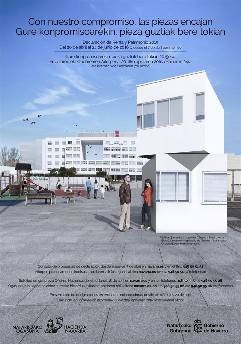 'Con nuestro compromiso, las piezas encajan' es el lema de la campaña de comunicación de este año. Se han escogido dos imágenes de los ámbitos de la sanidad y la educación, Complejo Hospitalario de Navarra y Universidad Pública, pilares del sistema de bienestar.