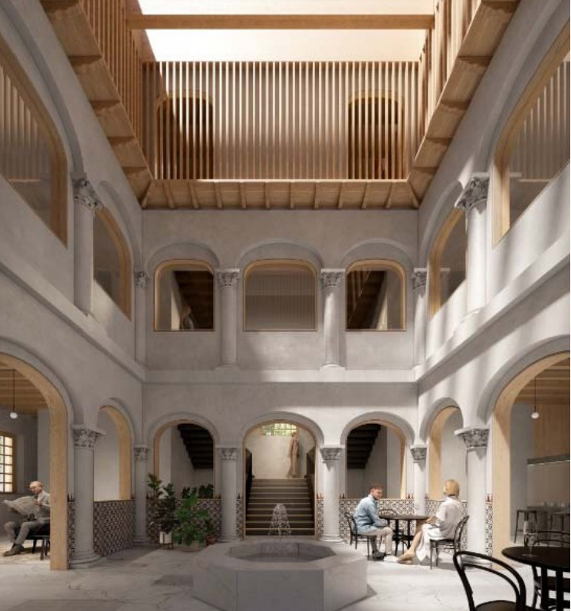 El porche de acceso existente desde el este da paso al patio, "protagonista absoluto" del edificio. Se mantendrá como patio abierto (se descarta cubrirlo), con la posibilidad de mantener plantas de exterior en el mismo. Las seis habitaciones se ubican todas ellas en planta baja.