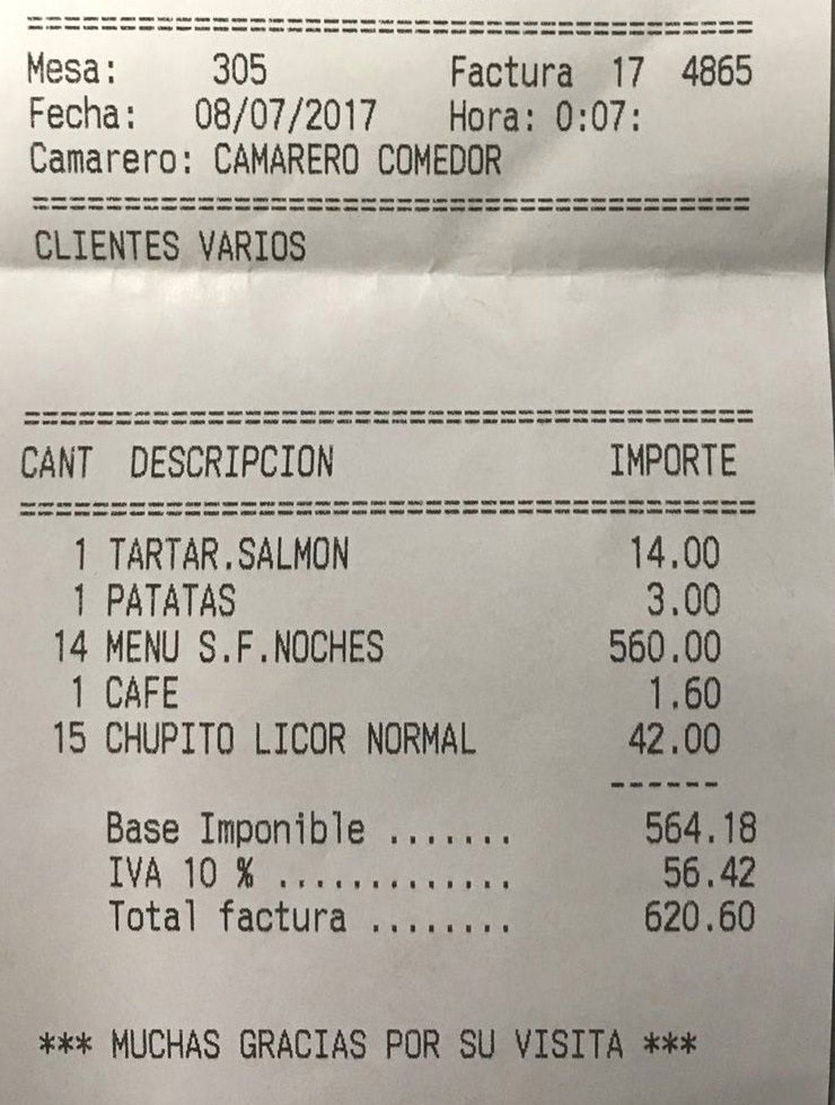 Los hechos ocurrieron en un restaurante del ensanche pamplonés. La cuenta de la cena ascendía a 620,60 euros e incluía catorce menús (560 euros), un tartar de salmón (14 euros), una ración de patatas (3 euros), un café (1,60 euros) y quince chupitos (42 euros).
