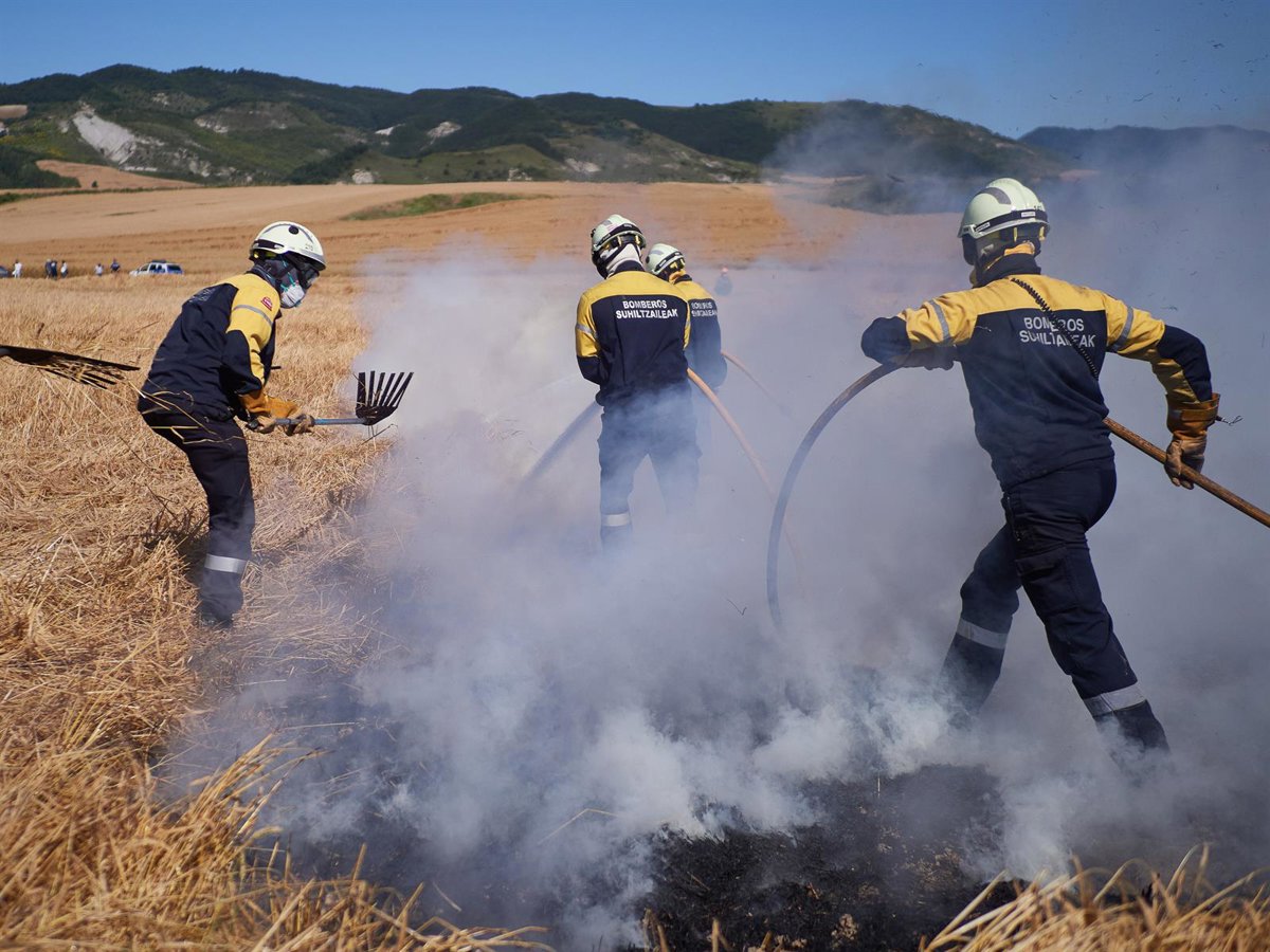 Varios bomberos realizan labores de extinción de un incendio forestal producido en una zona de campo de cereal, sin afectar a zonas urbanas, cerca de la localidad navarra de Sarriguren, a 21 de junio de 2020. - Eduardo Sanz / AFP7 / Europa Press - Archivo