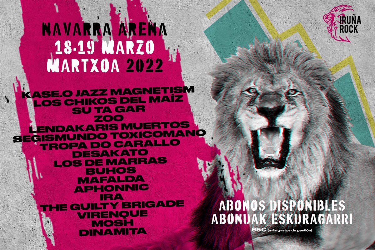 Un total de 17 grupos componen el cartel del Iruña Rock 2022, que tendrá lugar en el Navarra Arena los días 18 y 19 de marzo. Entre ellos, destacan agrupaciones como Los Chikos del Maíz, Su Ta Gar, Zoo, Lendakaris Muertos, Segismundo Toxicómano, Desakato, Los de Marras, Buhos, Mafalda, Aphonnic, Ira, The Guilty Brigade, Virenque, Mosh y Dinamita.