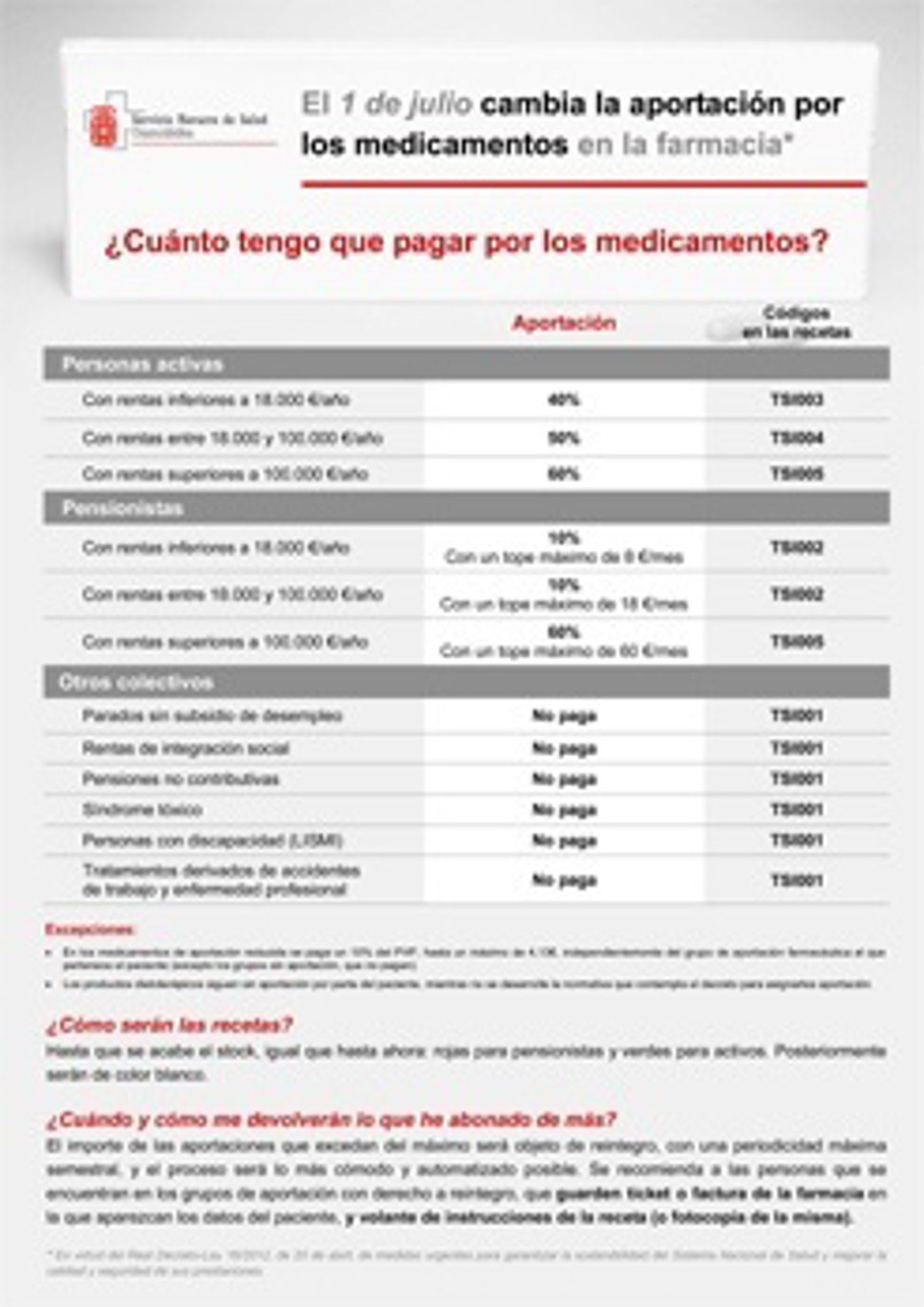 Cabe señalar que existen dos excepciones al copago según renta: En los medicamentos de aportación reducida se paga un 10% del PVP, hasta un máximo de 4,13 euros, independientemente del grupo de aportación farmacéutica al que pertenece el paciente. (Excepto los grupos sin aportación, que no pagan); y los productos dietoterápicos, siguen sin aportación por parte del paciente, mientras no se desarrolle la normativa que contempla el decreto para asignarles aportación.