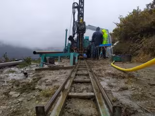 Dos sondistas del Servicio de Estudios y Proyectos realizan la excavación con una perforadora Edeco Traveller 30, una máquina de 5.000 kilos que perfora el subsuelo y permite extraer un fragmento del terreno. De este modo se consigue una muestra continua de toda la superficie atravesada, lo que se conoce como 'columna del sondeo'. Esta muestra permitirá conocer los diferentes estratos de la ladera, su composición y su disposición estructural para poder abordar el diseño y proceso de construcción de las infraestructuras subterráneas.