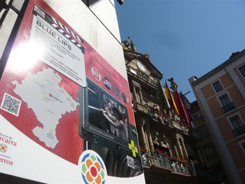 Los viajeros que lleguen a Navarra este verano encontrarán ya estos carteles en varios destinos como la plaza Consistorial de Pamplona (junto a la Oficina de Turismo), donde se puede visionar una escena de la película 'Blue Lips', una de las últimas producciones relacionadas con los Sanfermines estrenada en los cines, en Zugarramurdi, Artajona o las Bardenas Reales.