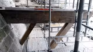 En estos momentos ya se ha cubierto el espacio con el correspondiente andamiaje de seguridad y se están instalando tres grandes escuadras de madera de roble (jácenas o vigas principales) que se insertan en los correspondientes huecos existentes en el trozo de lienzo que discurre entre el final del paseo extramuros y el Baluarte Bajo de Guadalupe. Aunque la ubicación de las escuadras es la original, se han colocado con anclajes ocultos de acero para garantizar su estabilidad.