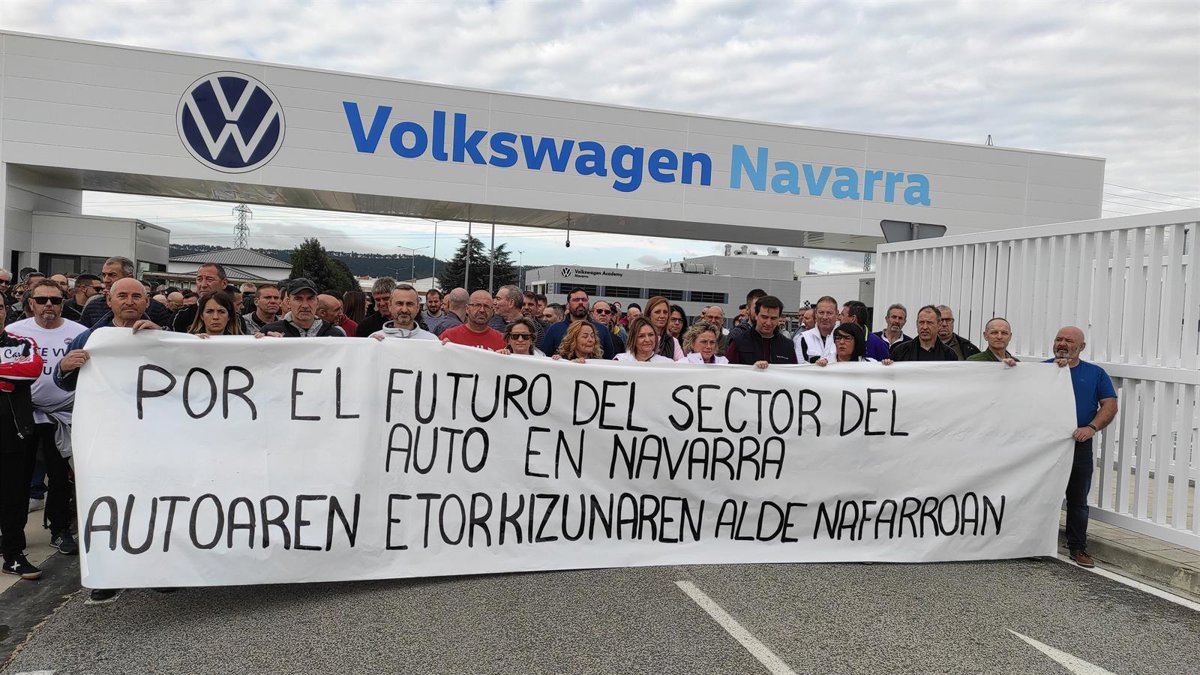 El comité de empresa de Volkswagen Navarra y representantes de comités de su parque de proveedores se han concentrado este lunes en la puerta principal de la factoría de Landaben para reclamar a la dirección del Grupo Volkswagen que la planta navarra y sus proveedoras "sigan siendo estratégicas más allá del año 2026" y que el proceso de reconversión hacia el vehículo eléctrico "no solo no deje a nadie fuera, sino que además, nos permita crecer".