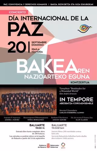El Departamento de Relaciones Ciudadanas, a través de la Dirección General de Paz, Convivencia y Derechos Humanos del Gobierno de Navarra, ha organizado el día 20 de septiembre, a las 19.00 horas en Baluarte, un concierto en el contexto del Día Internacional de la Paz.