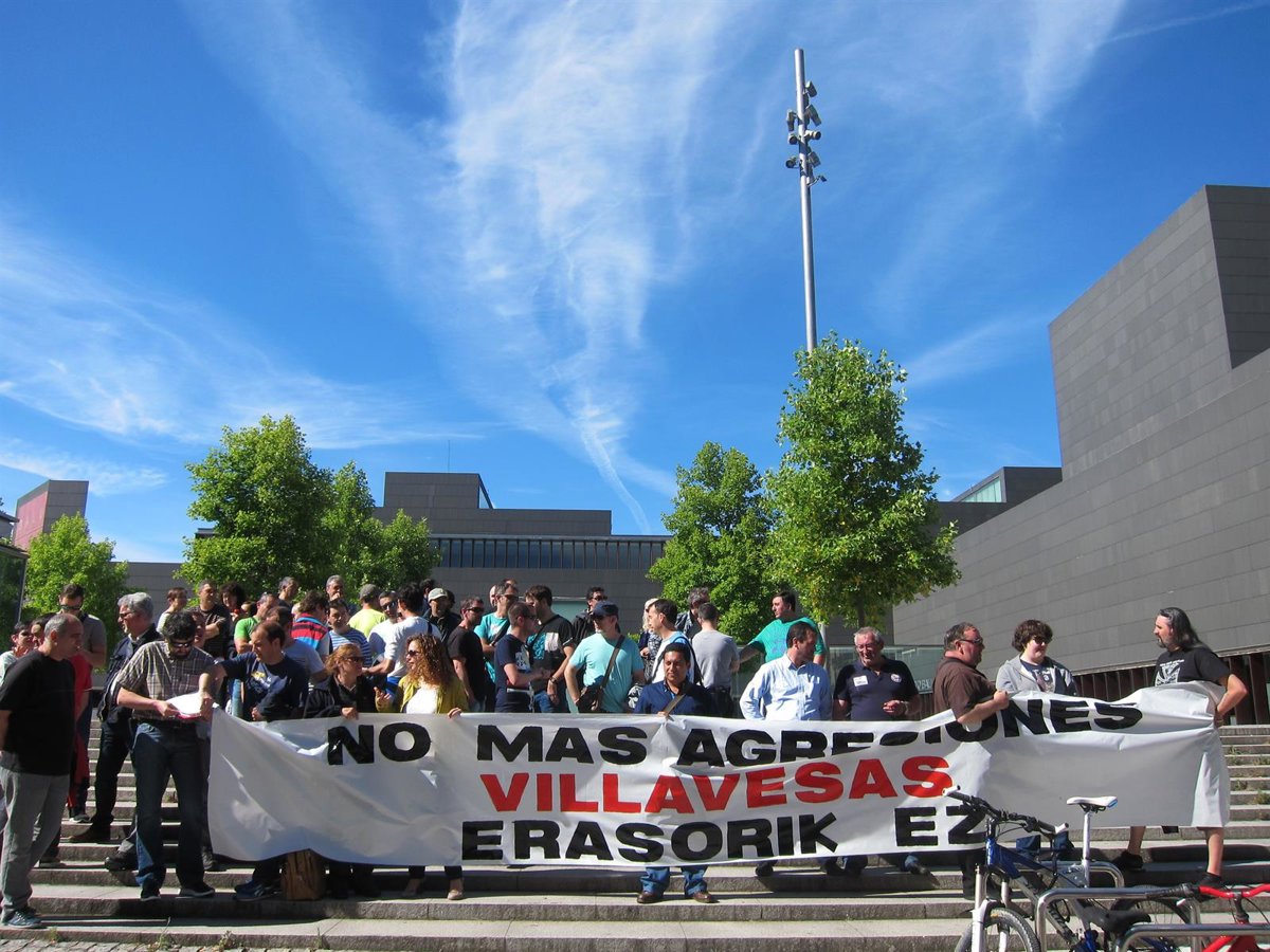 Los empleados se han concentrado frente a la sede de la MCP tras la pancarta 'No más agresiones villavesas. Erasorik ez' y han entregado a esta entidad, a la empresa TCC y a Inspección de Trabajo un escrito del comité de empresa en el que señalan "el aumento de agresiones" y piden que se activen medidas de seguridad.