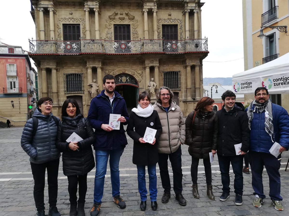 Carlos Guzmán y Begoña Alfaro (segundo y tercera por la izquierda) junto con otros candidatos de Contigo Navarra para las elecciones forales y municipales en la plaza del Ayuntamiento de Pamplona. - EUROPA PRESS