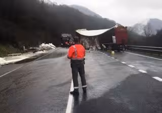 El accidente se ha producido por una salida de vía y pérdida de carga, sacos abono y gasoil, de un camión. Se llevan a cabo diligencias por daños materiales.