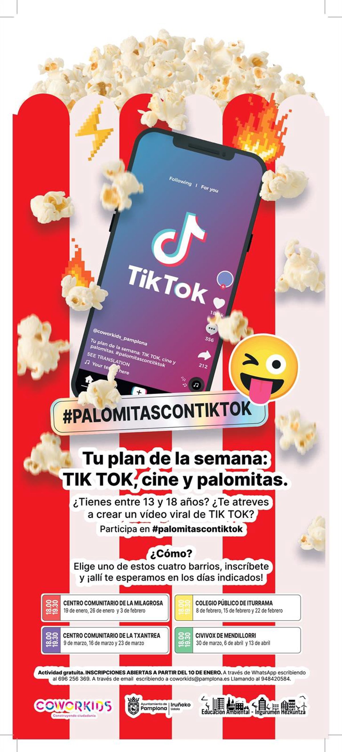 Por de pronto, #palomitascontiktok se celebrará en el centro comunitario de la Milagrosa los miércoles 19 y 26 de enero y el 2 de febrero. La siguientes tres semanas se trasladará al centro comunitario de Iturrama (los martes 8, 15 y 22 de febrero). En la Txantrea se organizará los primeros tres miércoles de marzo (los días 9, 16 y 23) y terminará en Mendillorri, los días 30 de marzo, 6 y 13 de abril. En todos los barrios, la actividad tendrá el mismo horario, de 18 a 19.30 horas.