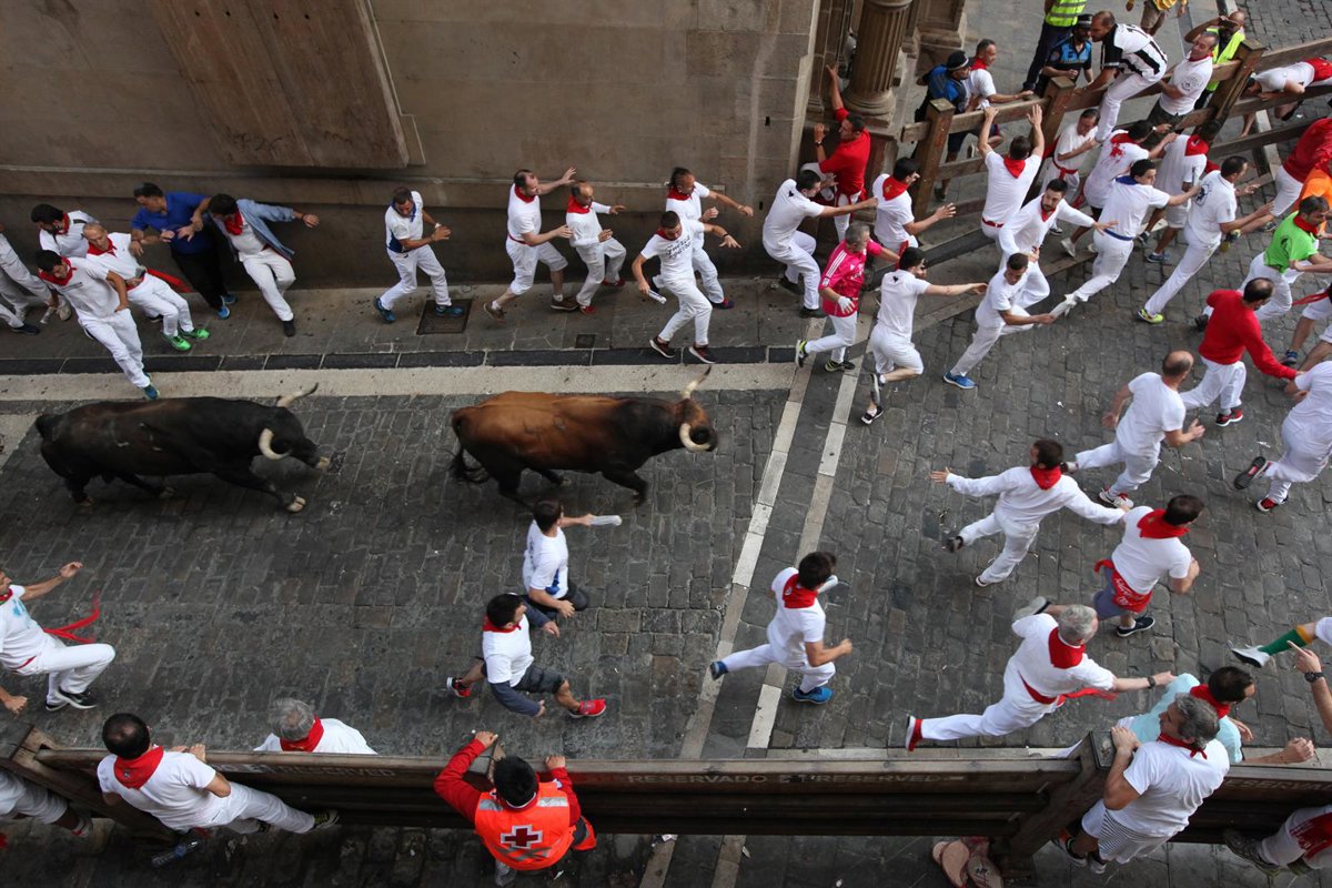 Cientos de personas corres en el séptimo encierro de las fiestas de San Fermín con los toros de La Palmosilla celebrado en Pamplona (Navarra). - David Domench - Europa Press