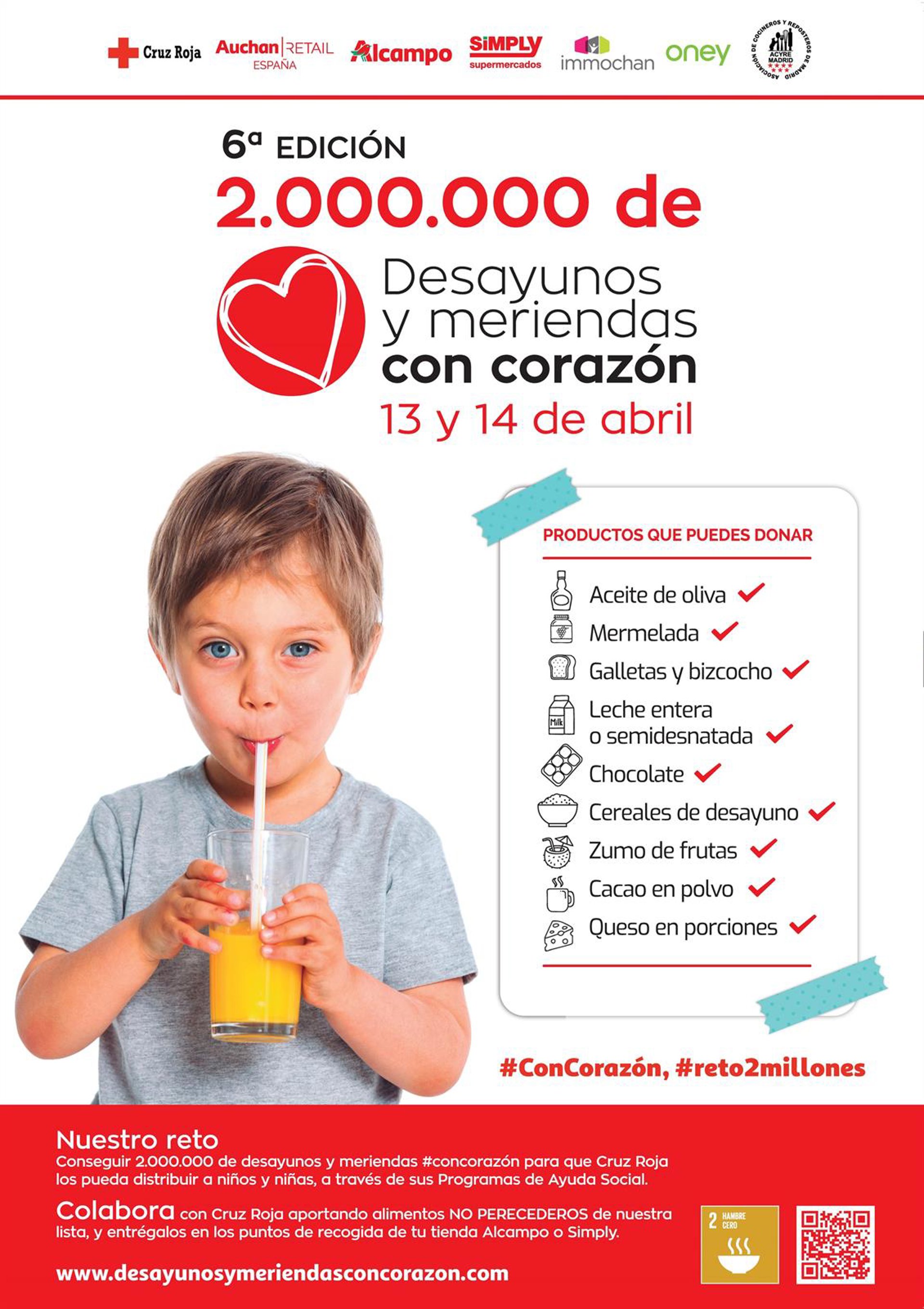 Este viernes y sábado, 13 y 14 de abril, tendrá lugar la VI edición de la campaña 'Desayunos y Meriendas #ConCorazón' de Cruz Roja, cuya finalidad es recoger alimentos de desayunos y meriendas para la infancia que vive en familias con dificultades. El reto es alcanzar 2 millones de desayunos y meriendas.