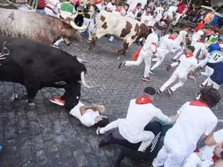 Un hombre tirado en el suelo durante el primer encierro de las Fiestas de San Fermín 2022 de la ganadería de Núñez de Cuvillo, a 7 de julio de 2022, en Pamplona, Navarra (España). - Eduardo Sanz - Europa Press