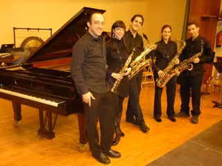Este cuarteto está compuesto por Aurora Vives, saxofón soprano; Eduardo Rubio, saxofón alto; Ana García, saxofón tenor; Eneko Anaut, saxofón barítono; y Aldredo Echeverría, piano. Cuatro de ellos son alumnos del aula de saxofón del Conservatorio de Música de Navarra. En el escenario estarán acompañados por la profesora Aurora Vives y por el repertorista Alfredo Echeverría.