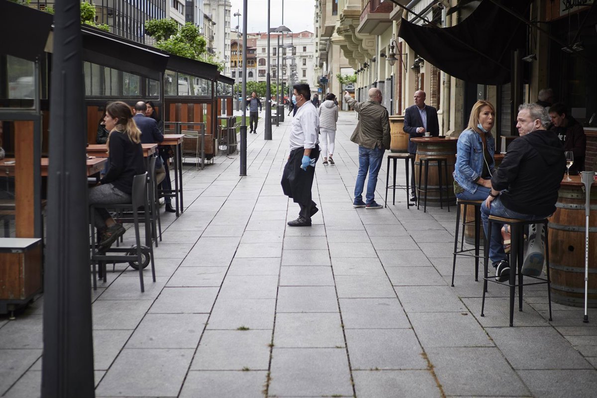 Varias personas en las primeras terrazas que abren en Pamplona, el día en el que la capital navarra pasa junto el resto de la comunidad a la Fase 1 del Plan de Desescalada establecido por el Gobierno de España. En esta fase, las terrazas de los restaura - Eduardo Sanz - Europa Press
