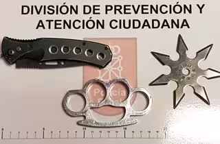 Entre sus pertenencias encontraron un arma arrojadiza prohibida, consistente en una estrella de acero de siete puntas afiladas de 10 centímetros de diámetro conocida como 'Shuriken', un puño americano metálico, y una navaja con empuñadura metálica negra y hoja de un solo filo de 10 centímetros, con mecanismo de apertura lateral automático.