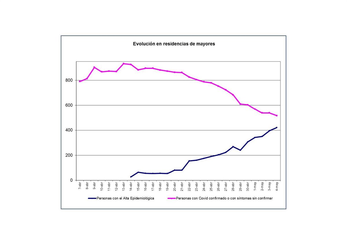Desde la detección del pico más alto de la enfermedad en las residencias, con 933 casos confirmados o con síntomas, registrado el pasado 13 de abril, en estos momentos el número de casos confirmados es de 510, de los cuales 491 permanecen en las residencias y 19 se encuentran hospitalizados; otras siete personas presentan síntomas compatibles con Covid-19.