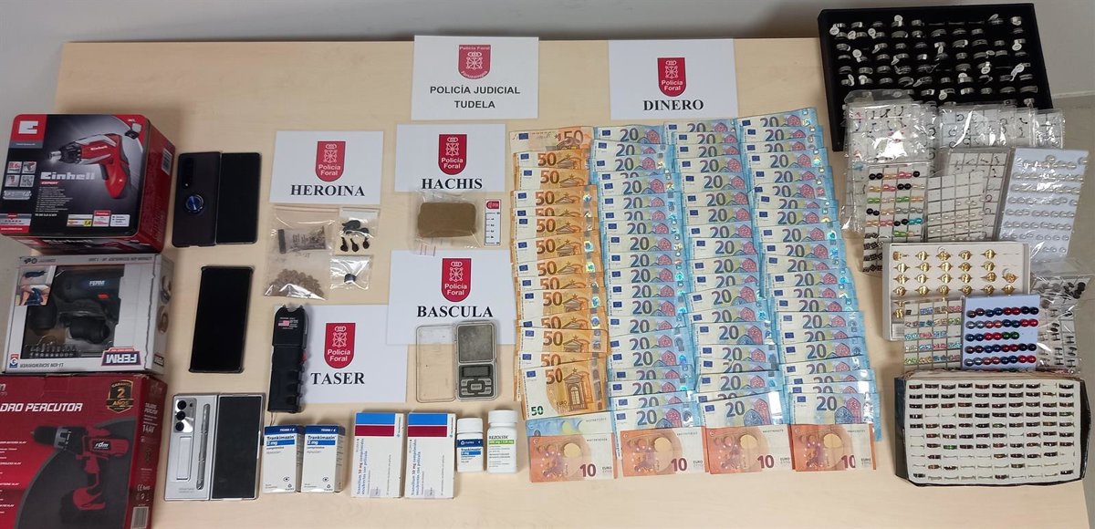 Tras la correspondiente autorización del Juzgado de Guardia de Tudela se realizó una entrada y registro del domicilio, en la que participaron también agentes del GIE (Grupo de Intervenciones Especiales) y del Grupo de Guías Caninos, procediendo a la detención del varón, con antecedentes policiales. En la inspección se localizaron 13 gramos de heroína, 85 gramos de hachís, 2.000 euro en metálico, un táser o defensa personal eléctrica y diversos instrumentos relacionados con el delito, como una báscula de precisión, además de objetos de procedencia ilícita como taladros, atornilladores y numerosas piezas de bisutería de origen desconocido que se está investigando.