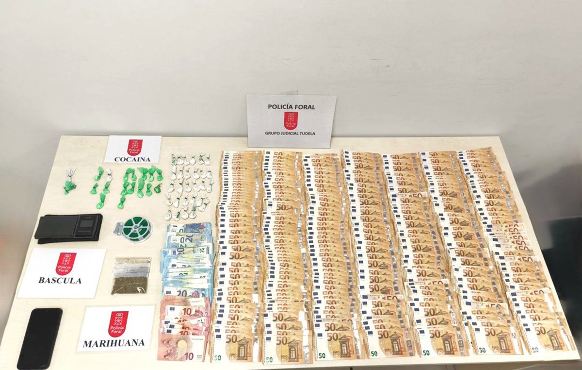 Según detallan desde la Policía Foral, en el registro efectuado por la policía judicial se obtuvieron las siguientes evidencias: 50 gramos de cocaína preparadas para su posterior venta, 10 gramos de marihuana, diferentes útiles empleados para el tráfico de drogas, y 16.960 euros en efectivo.